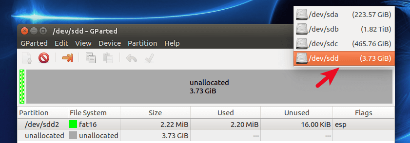 Select your USB drive in the top right menu. Please note that your USB drive may not be /dev/sdd. You can recognize your USB drive by its capacity.