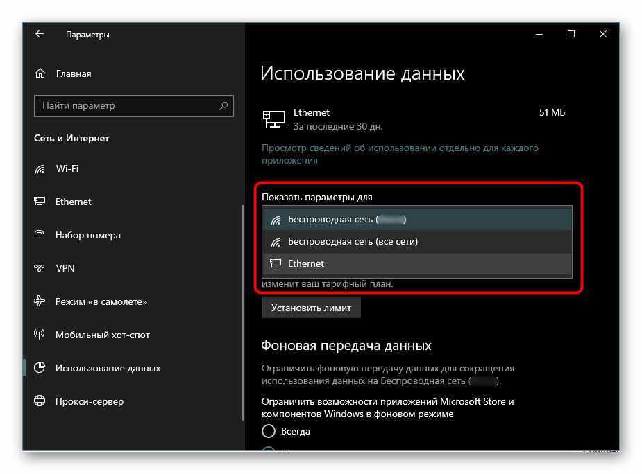 По умолчанию установка лимита происходит для того вида подключения к сети, которой используется на данный момент. Если вам также надо настроить и другой вариант, в блоке «Показать параметры для» выберите из выпадающего списка нужное подключение. Таким образом, вы можете настроить не только Wi-Fi соединение, но и LAN (пункт «Ethernet»).