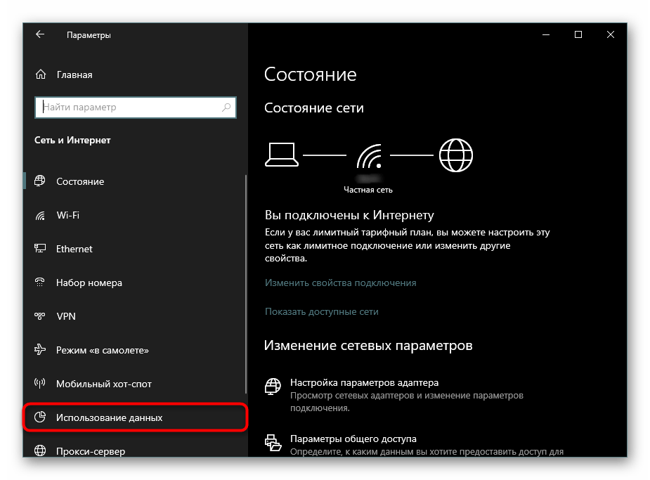 - Зайдите в раздел «Использование данных» в параметрах «Виндовс» для сети и интернета.