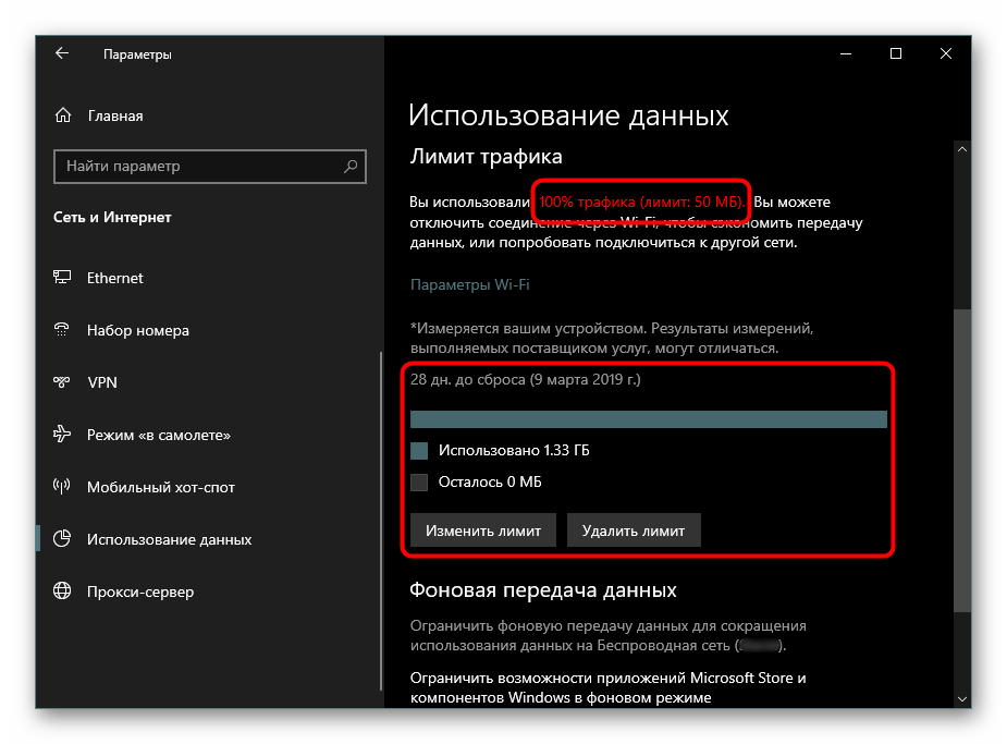 Когда вы достигнете установленного лимита, операционная система уведомит вас об этом соответствующим окном, где также будет содержаться инструкция об отключении передачи данных:
