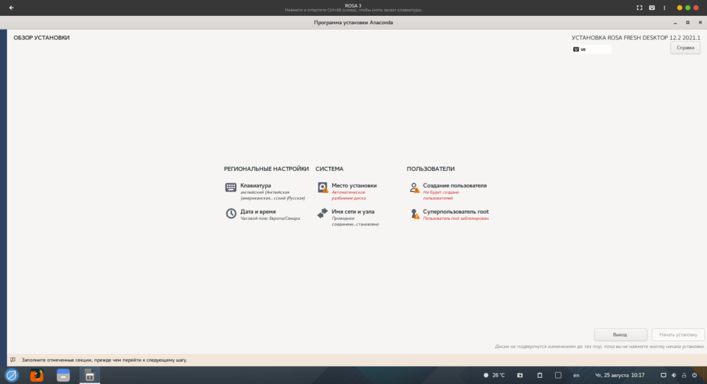 Установка начнется, а мы в это время должны будем указать пароль для пользователя root и создать пользователя, под которым будем работать, для этого поочередно заходим в соответствующие настройки.