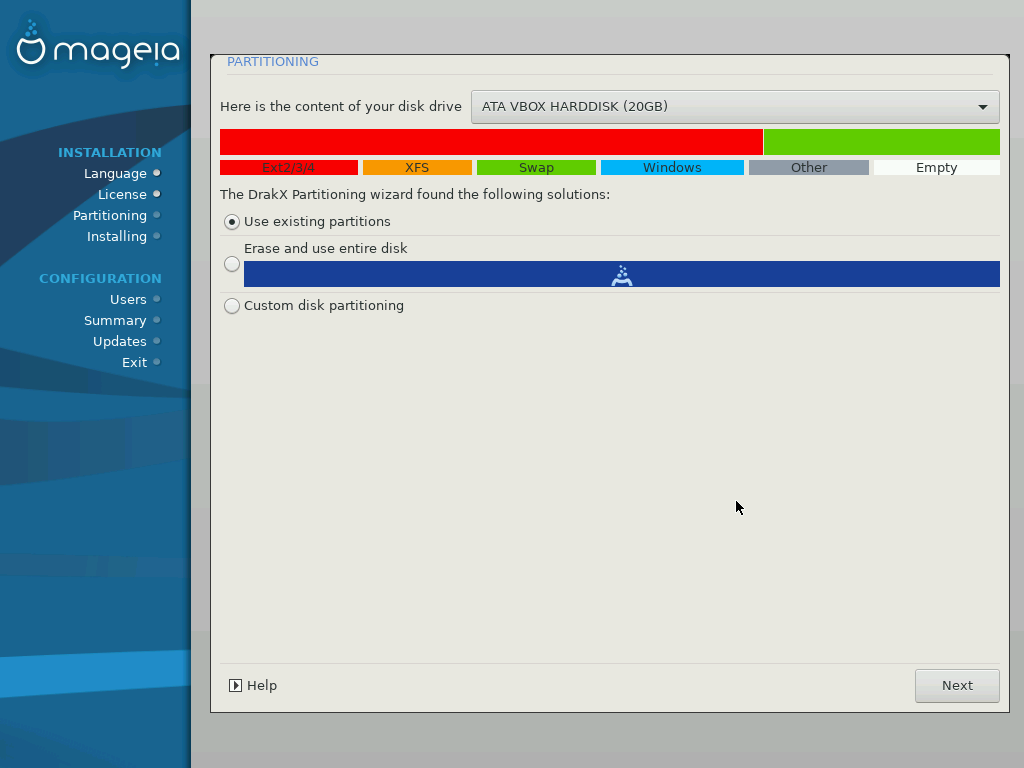 In this case you will have one or more OS already installed on the device you want to use to install Mageia. You can choose to use existing partitions, erase and use the entire disk or perform custom disk partitioning.