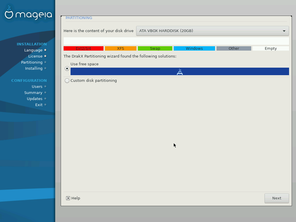 The image above shows an empty disk. In this case you can simply select «Use free space» and let Mageia handle it. If you have a disk with one or more OS installed go to the next step.