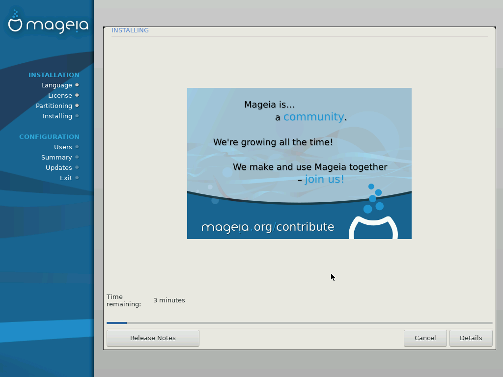In this step Mageia will finalize your installation, it can potentially take a long time. Also, the installation is not yet complete and will require further input.