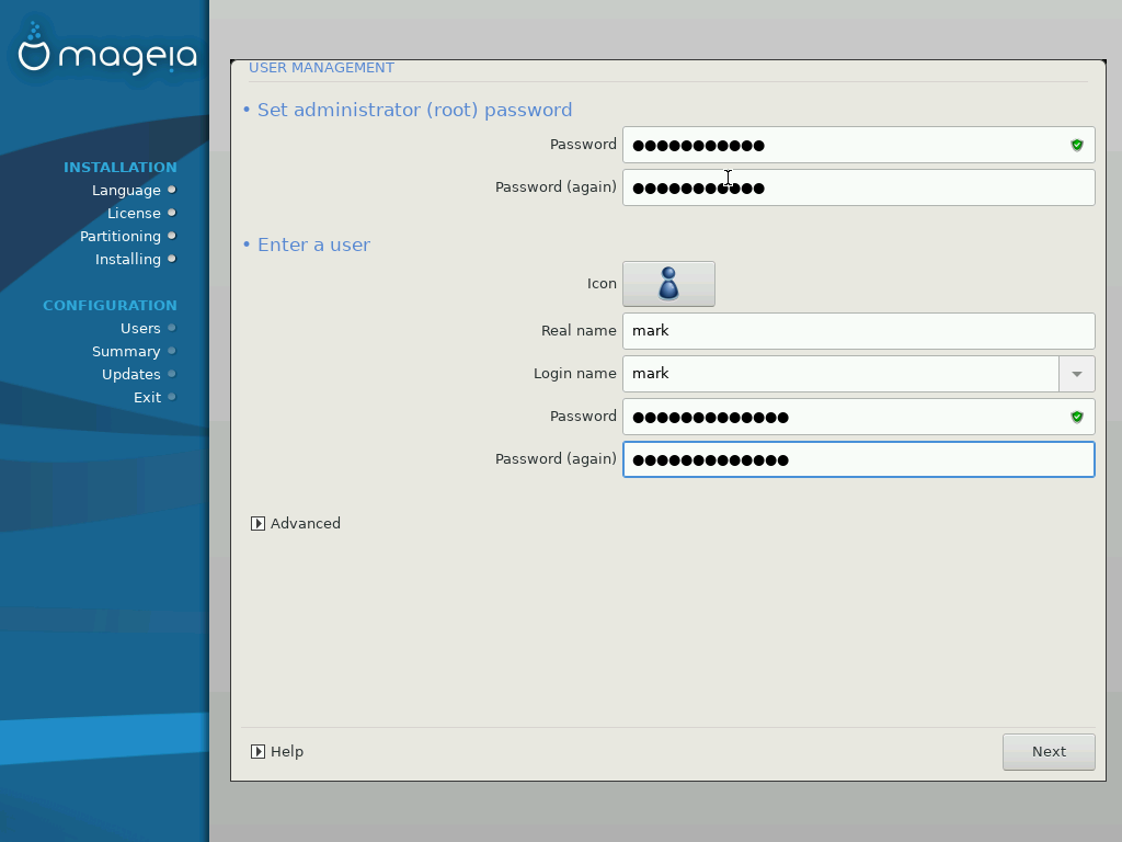 In this step you need to configure both your account and a root account. Be careful to remember both password! If you lose either one it can be difficult to recover them if you’re not an advanced user!From the Advanced option you can choose UID and GID of the newly created user.