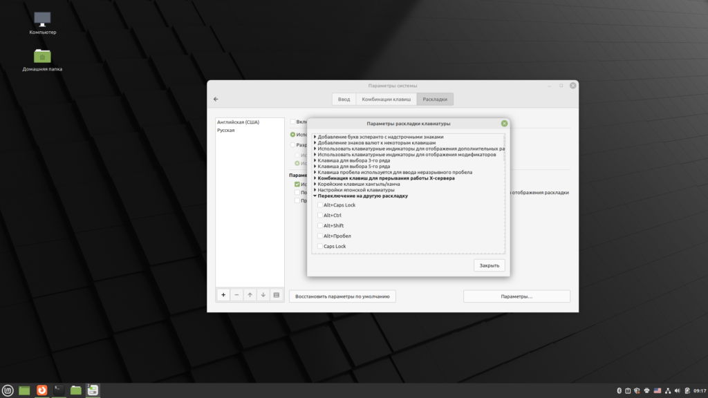 Следующим этапом назначим комбинацию клавиш по которой будет происходить переключение клавиатуры. Для этого все в этой же вкладке нажимаем на кнопку “Параметры” и из выпадающего списка находим пункт “Переключение на другую раскладку”, тут необходимо отметить комбинацию клавиш, по которой и будет выполняться данное действие: