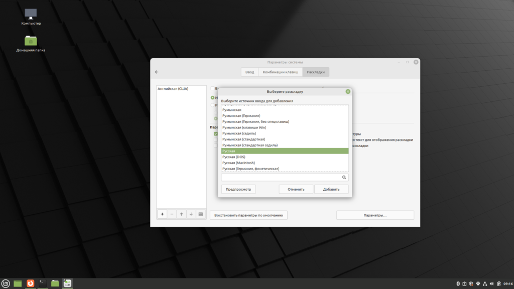 Далее переходим во вкладку “Раскладки”, нажимаем на крестик внизу и добавляем необходимый язык, в моем случае это Русский: