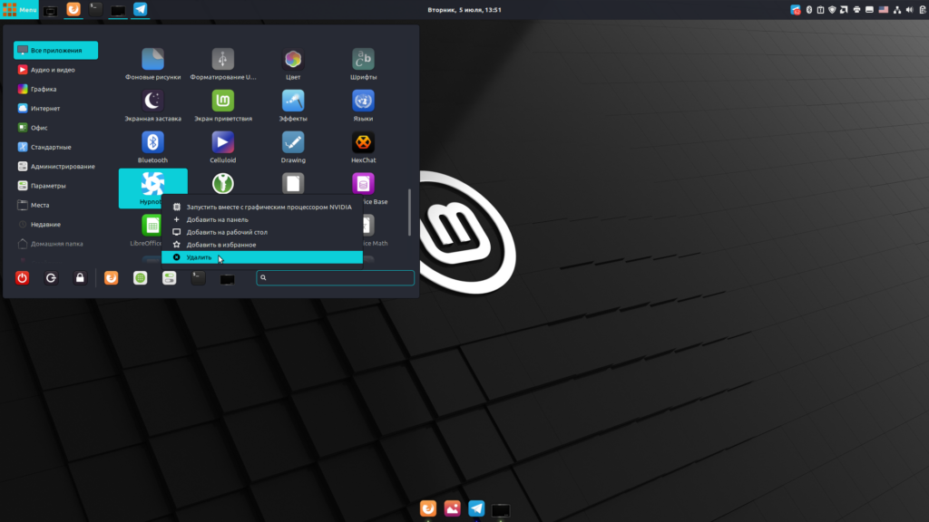 В Linux Mint существует и третий способ удаления программного обеспечения, открываем меню, правой клавишей щелкаем на иконке программы которую хотим удалить и выбираем пункт “Удалить”: