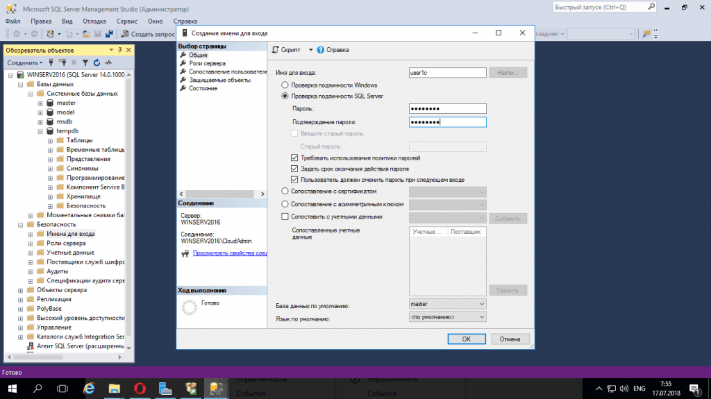 Закройте окно свойств. Перейдите в раздел Безопасность, Имена входа. Щелкните правой кнопкой мыши на разделе Имена входа и выберите команду Создать новое имя входа. Создайте новую учетную запись пользователя, от имени которого будет подключаться 1С — использовать учетную запись администратора (sa), предоставив 1С максимальные права, мягко говоря, неправильно.