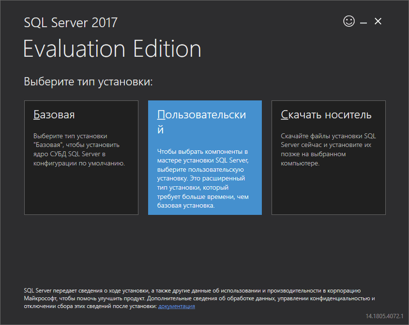 Рекомендуется в имени и пароле использовать только буквы латиницы и цифры, кириллица будет привносить риски локальных сбоев из-за особенностей обработки. Теперь можно запускать файл с дистрибутивом MS SQL Server. Программа предложит 3 варианта действий: базовая инсталляция с настройками «по умолчанию», выборочный режим или скачивание файлов «на потом».