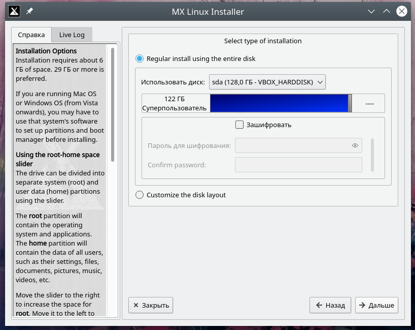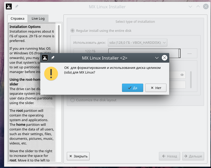 Ну, кажется, с общими рассуждениями покончено окончательно. Так что переходим к банальной рутине — то есть дисковой разметке, каковой инсталлятор MX предлагает заняться первым делом. И предлагает сделать это в одном из двух режимов: автоматическом, с использованием всего целевого носителя (и уничтожением его содержимого, буде таковое имелось), или ручном (Customize the disk layout):