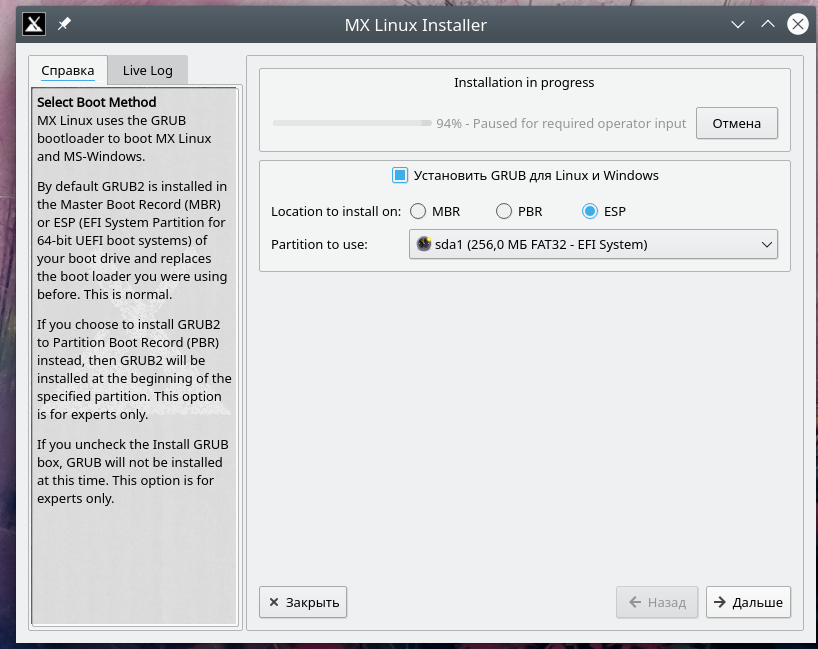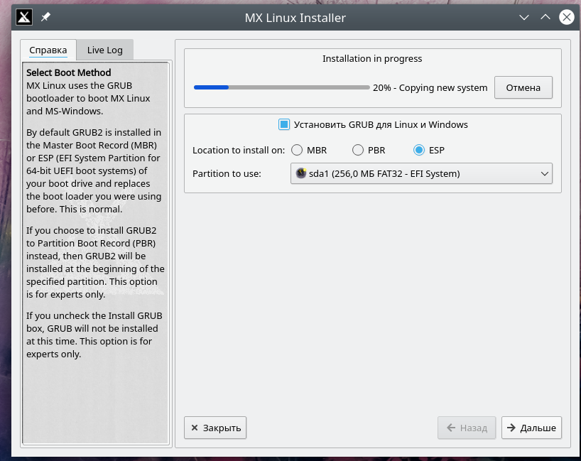И вторая вещь — не забыть этот раздельчик создать в процессе установки. Или заранее, с помощью утилит типа , или Gparted, и определить его тип как EFI System. Впрочем, как мы скоро увидим, инсталлятор MX избавит нас от лишних хлопот, позаботившись об этом. А пока продолжим общие рассуждения.