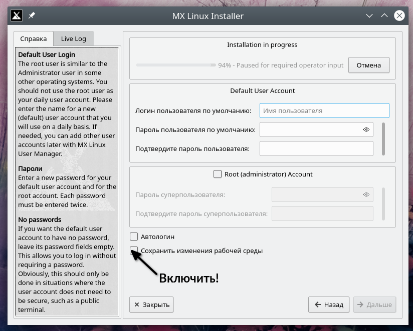 А вот опцию Сохранить изменения рабочей среды следует включить непременно: именно она отвечает за наследование установленной системой настроек, сделанных в Live-режиме. Более того, благодаря ей можно уже «вживе» выполнить перекомплектацию системы — удалить ненужные пакеты и добавить необходимые, получив в итоге вполне кастомизированную систему.