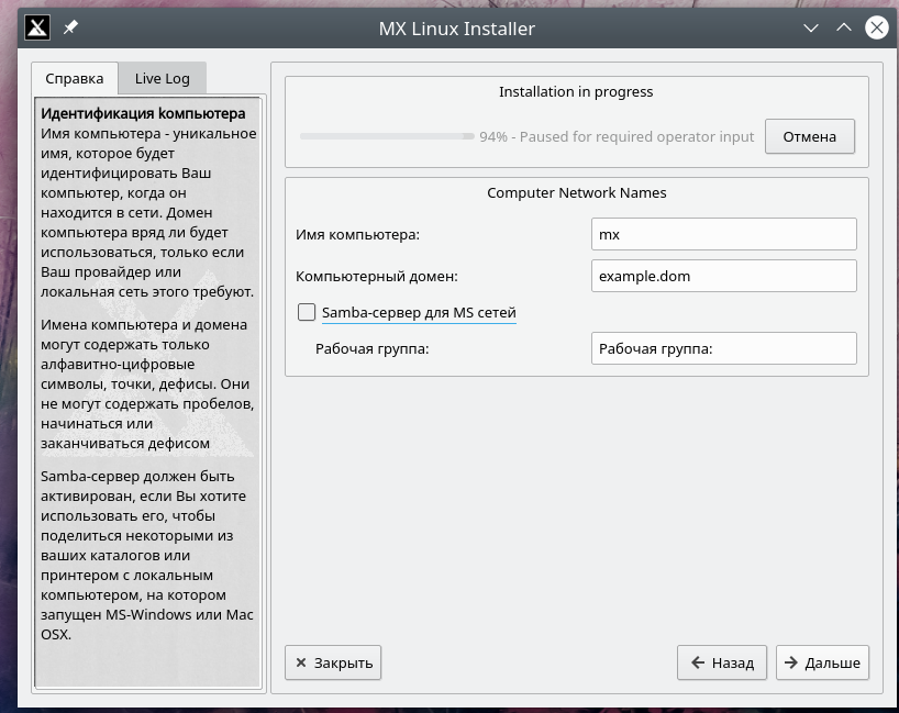 Но, не дожидаясь «тормоза» (или сразу вслед за ним) можно задавать параметры сети (имя машины и домен)