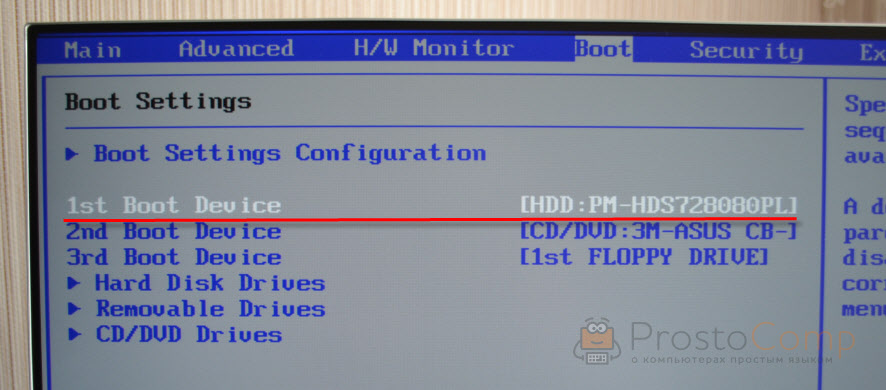 2 Необходимо зайти в меню BIOS (в моем случае клавиша F2) и проверить порядок загрузки. В разделе Boot, на первом месте должен стоять жесткий диск (HDD). Дальше может идти CD/DVD и FLOPPY (если он у вас есть). А вообще советую отключить дисковод.