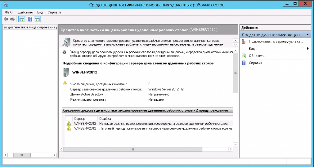 Средство диагностики сообщит, что доступных лицензий пока нет, поскольку не задан режим лицензирования для сервера узла сеансов удаленных рабочих столов (рис. 15). Также средство диагностики сообщит, что льготный период (по умолчанию 120 дней) еще не истек, но этот сервер еще не настроен на использование хотя бы одного сервера лицензирования.