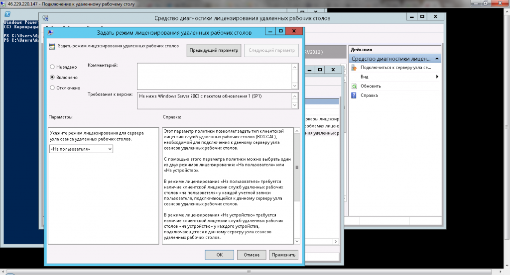 Далее откройте параметры Задать режим лицензирования удаленных рабочих столов. Установите переключатель в положение Включено и укажите режим лицензирования сервера узла сеансов удаленных рабочих столов. Возможно два варианта — «На устройство» или «На пользователя». Представим, что у вас есть 10 лицензий. В режиме «На устройство» вы можете создать неограниченное число пользователей на сервере, которые смогут подключаться через удаленный рабочий стол только с 10 компьютеров, на которых установлены эти лицензии. Если выбрать режим «На пользователя», то зайти на сервер смогут только 10 выбранных пользователей, но с любых устройств. Часто режим «На пользователя» более предпочтительный, поэтому его и выбираем.