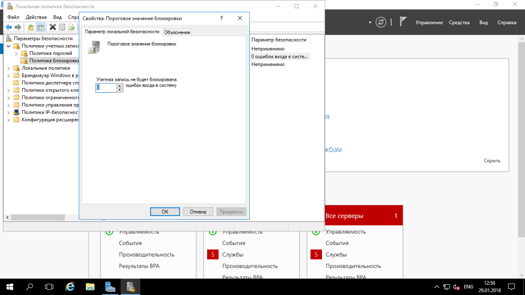 Необходимый набор правил и настроек называется Политика блокировки учетной записи (Account Lockout Policy). Пока вы еще не закрыли окно Локальная политика безопасности, перейдите в раздел Политики учетных записей, Политика блокировки учетной записи. Установите Пороговое значение блокировки — 5 (максимум 5 неудачных попыток входа), Продолжительность блокировки учетной записи — 30 (на 30 минут учетная запись будет заблокирована после 5 неудачных попыток входа).