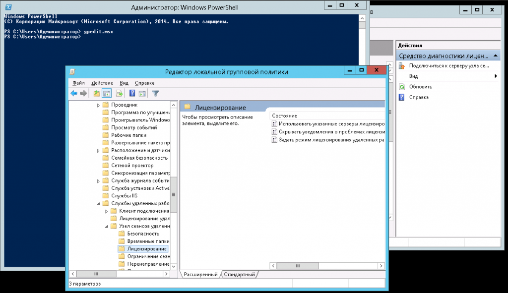 В Windows Server 2012 сервер лицензирования указывается в локальных групповых политиках, поэтому выполните команду gpedit.msc, чтобы открыть редактор локальной групповой политики.