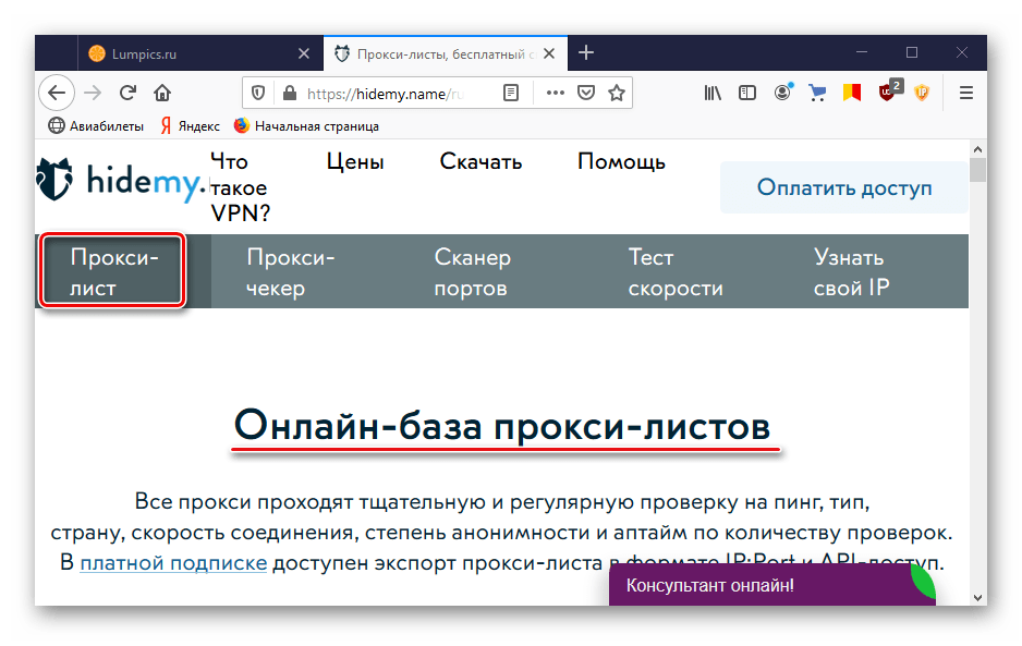 - Запускаем сервис, открываем вкладку «Прокси-лист» и попадаем в онлайн-базу прокси-листов.