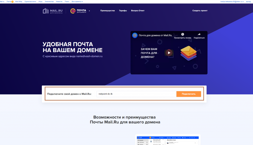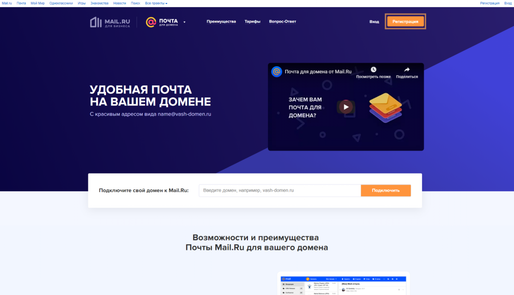 После регистрации вы будете переадресованы автоматически на главную страницу сервиса. Введите в поле «Подключите свой домен в Mail.ru» ваше доменное имя и нажмите на кнопку «Подключить».