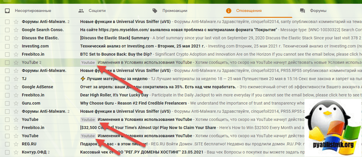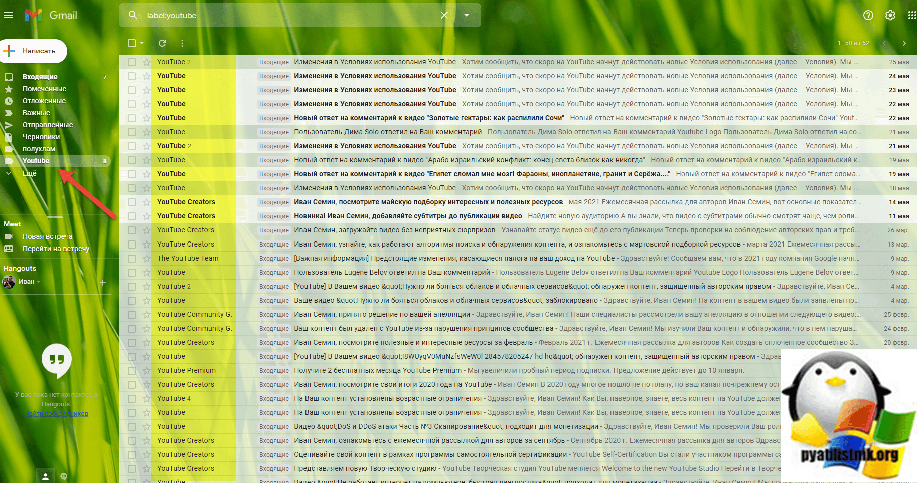 Теперь открыв ярлык «Youtube» вы увидите ваши отфильтрованные письма.