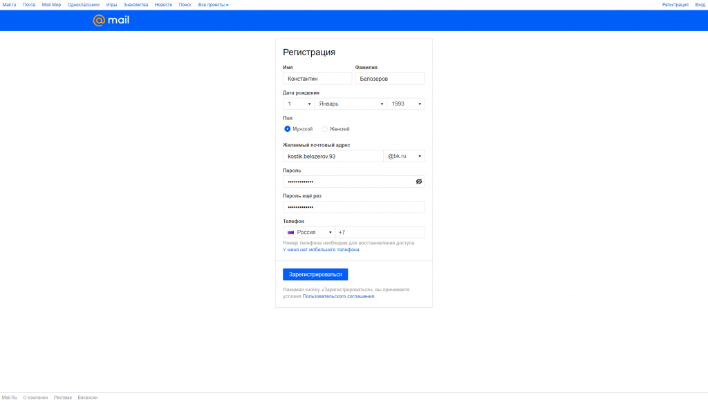 Введите ваши данные в поля формы для регистрации аккаунта. Можете указать свой номер мобильного телефона по желанию.