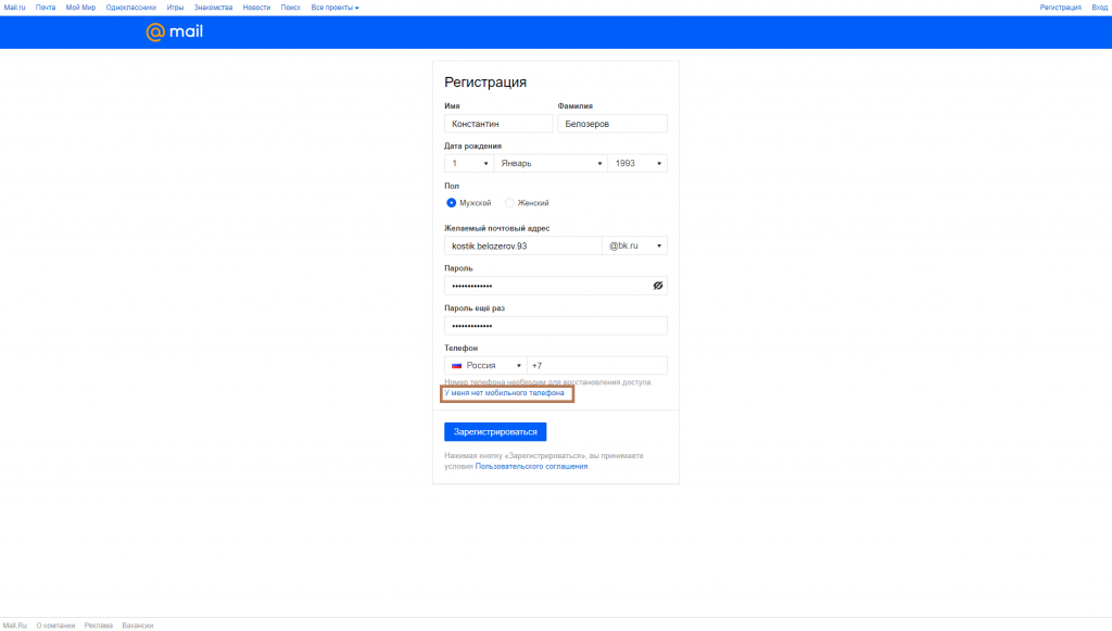 Если вы решили не указывать номер мобильного телефона, нажмите на ссылку «У меня нет мобильного телефона».