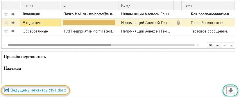 Вложения писем отображаются внизу окна с иконками типов файлов (письмо, документ Microsoft Word, PDF-файл) и открываются кликом. Сохраняются все файлы командой Сохранить все вложения.