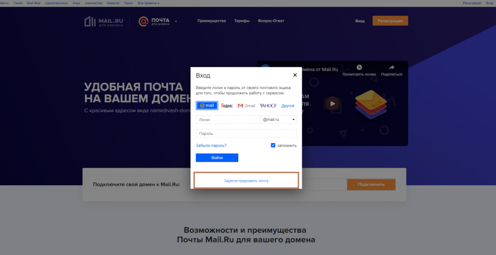 В открывшемся окне нажмите на ссылку «Зарегистрировать почту». На скриншоте ссылка отмечена цветным прямоугольником.