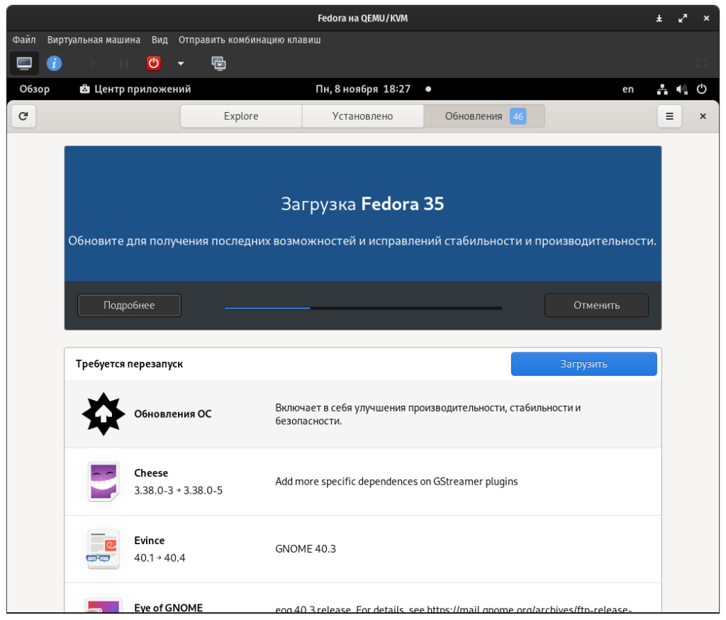 Нажимаем на кнопку “Загрузить” что бы началась загрузка пакетов для обновления системы до Fedora 35. Загрузка займет некоторое время в зависимости от скорости вашего интернета: