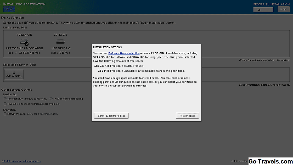 Если на вашем жестком диске имеется другая операционная система, вы, скорее всего, получите сообщение о том, что для установки Fedora недостаточно свободного места, и вам предоставляется возможность освободить место.
