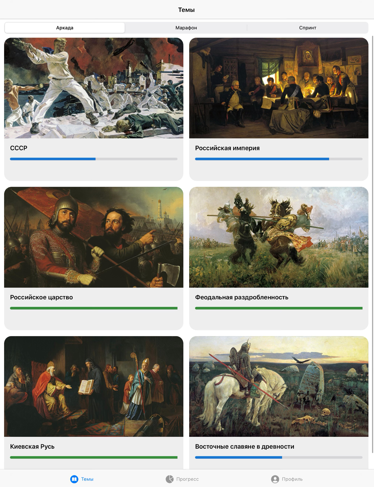 Представленные в приложении вопросы охватывают все периоды и ключевые события нашей истории. В игре два режима — марафон и спринт, интерфейс прост и понятен, а также есть возможность выбора исторического периода.