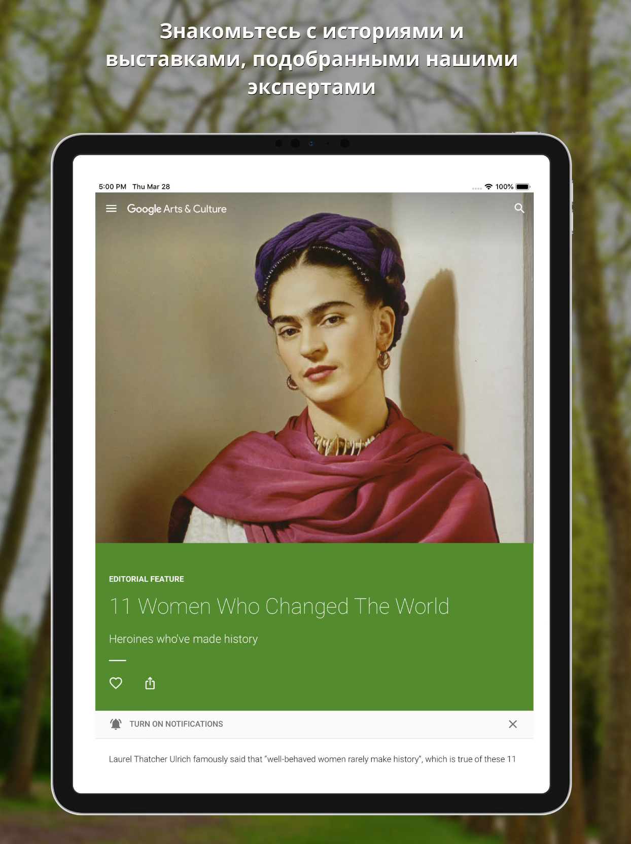 Приложение рассказывает интересные факты об известных произведениях искусства и культуры. Можно посещать виртуальные выставки и ближе знакомиться с музейными экспонатами. Также приложение знакомит с культурой разных стран и регионов.