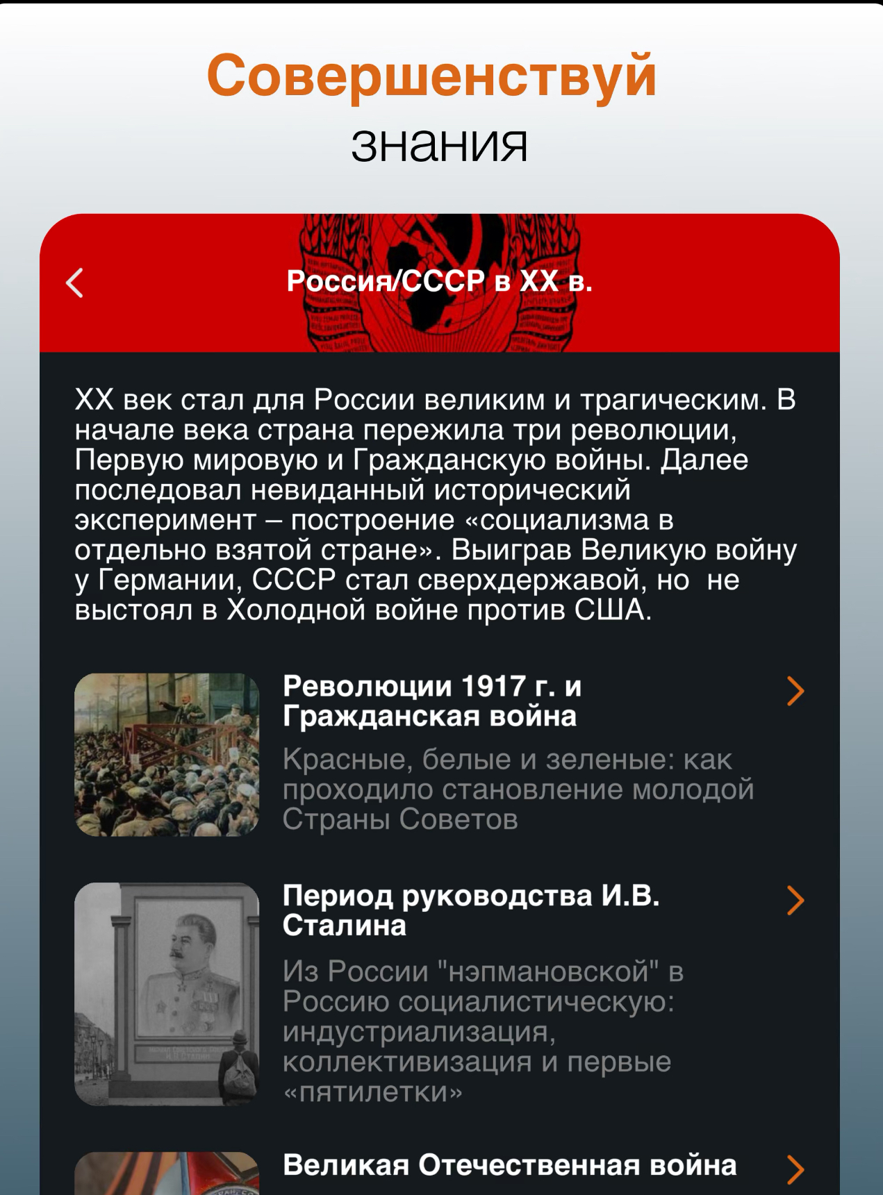 Приложение, в котором можно не только читать краткие исторические сведения и интересные факты, но и проходить тесты, играть в викторину. Отличная тренировка перед ЕГЭ по истории.