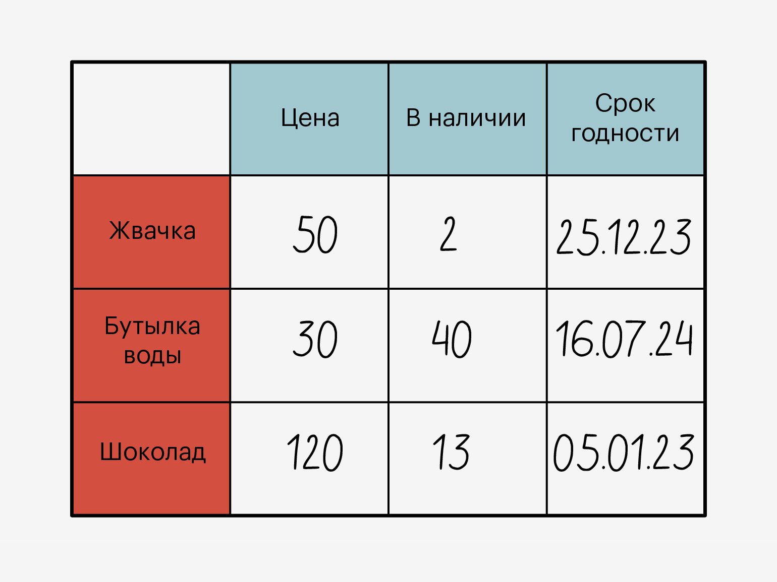 Если создать базу данных для магазина продуктов, то у каждого товара — например, жвачки, шоколадки и бутылки воды, — будут свойства: цена, количество штук в наличии и срок годности.