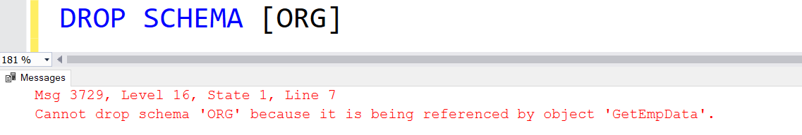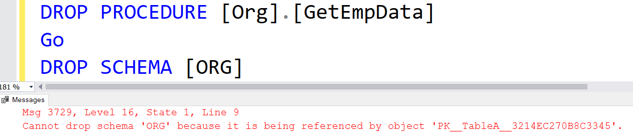 Therefore, you can either transfer the object to a different schema or drop the objects first. For example, let us drop GetEmpData stored procedures and then try to drop the schema. We again got an error because we have in the schema.