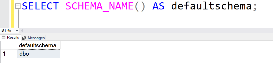By default, SQL Server uses schema for all objects in a database. We can query SCHEMA_NAME() to get the default schema for the connected user.