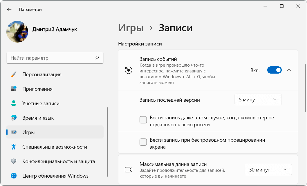 В разделе Параметры > Игры > Записи напротив Запись событий > Включено. Разверните и выберите Запись последней версии время 15, 30 секунд, или 1, 3, 5 и даже 10 минут. В процессе нажмите Win + G и выберите Записать последнюю минуту, или сразу же сочетание Win + Alt + G.
