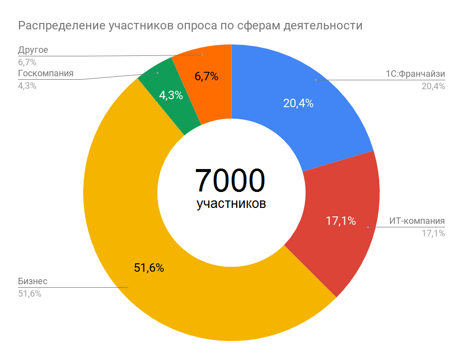 1С:Франчайзи – примерно пятая часть респондентов, чуть меньше доля среди опрошенных у ИТ-компаний (не франчайзи 1С) – около 17%. Работники государственных предприятий составили лишь порядка 4%, что можно объяснить не только строгой конфиденциальностью, но и отсутствием желания свидетельствовать, что госструктуры все еще сильно зависят от зарубежных ИТ.