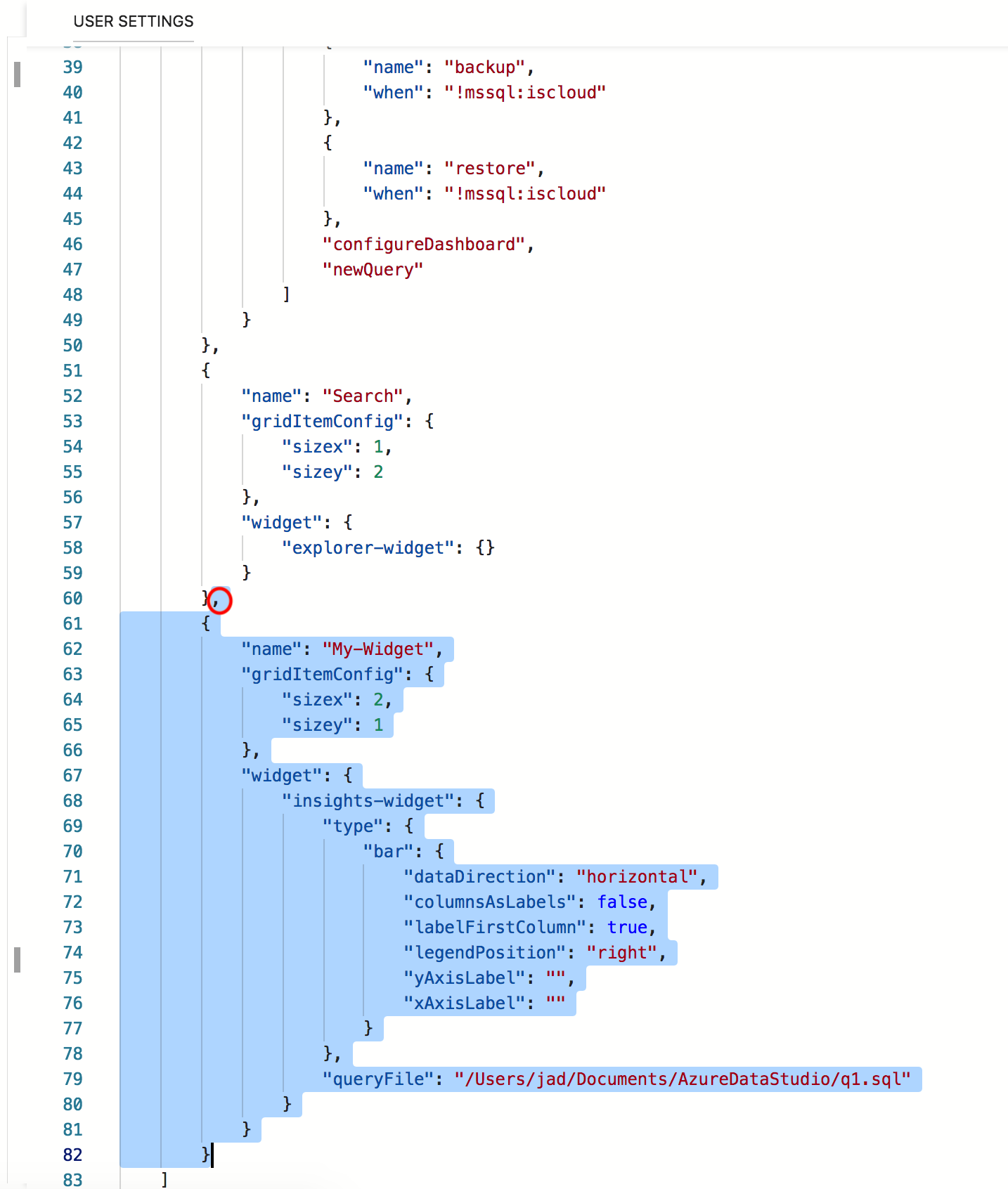 9. Вставьте свои настройки после последнегоперед, Посмотрите эту запятую, не забудьте добавить ее прямо перед вставленными настройками.
