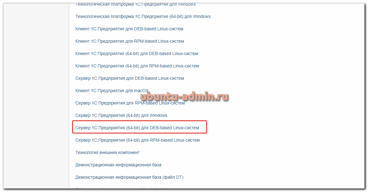 Свою настройку сервера 1С на Linux начнём с установки 1С:Предприятие. Установочные пакеты можно загрузить с сайта https://releases.1c.ru. Для этого у вас должна быть активна учётная запись. В принципе, файлы можно скачать где-то в интернете и без неё, но так как сервер 1С нужно регулярно обновлять, без своей учётной записи будет неудобно. Загрузить нужно файл Cервер 1С:Предприятия (64-bit) для DEB-based Linux-систем.