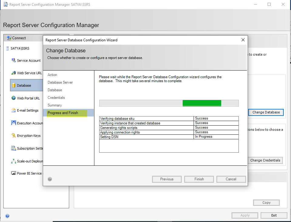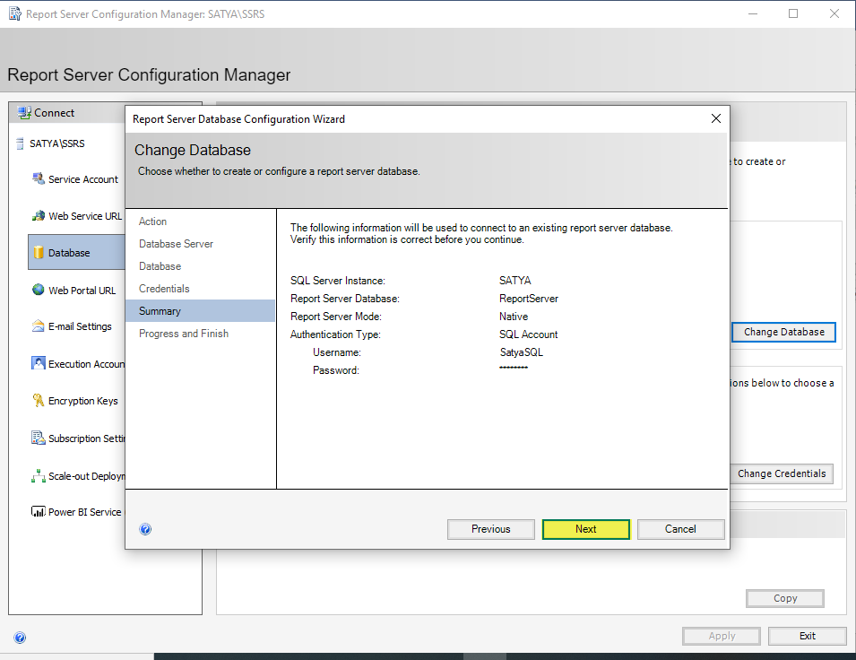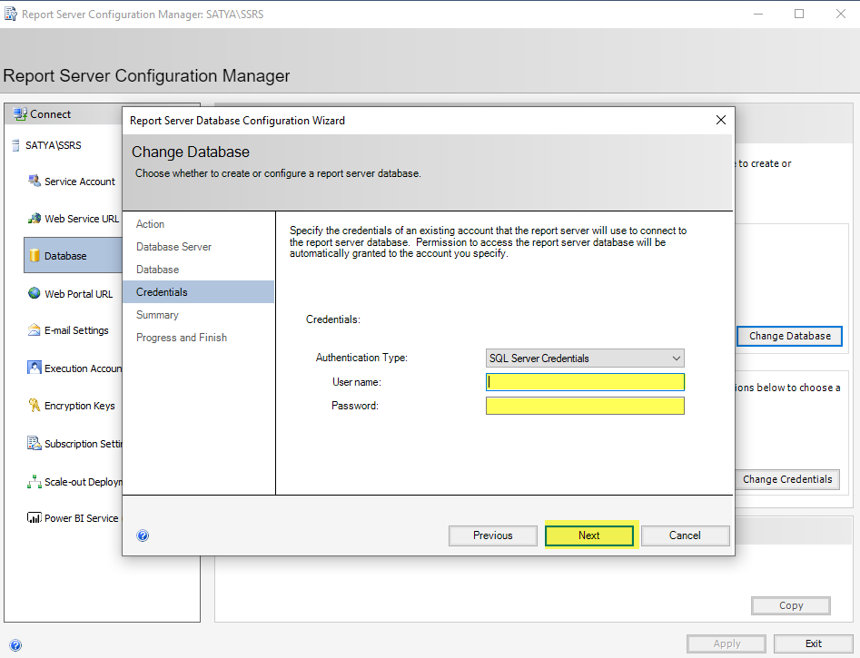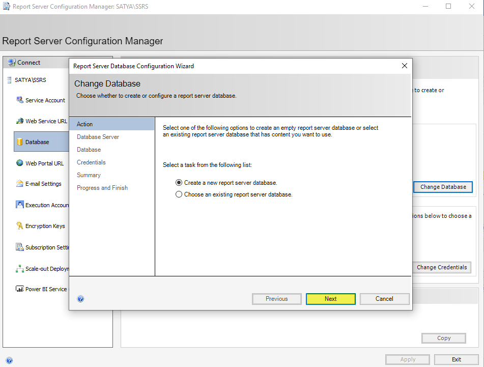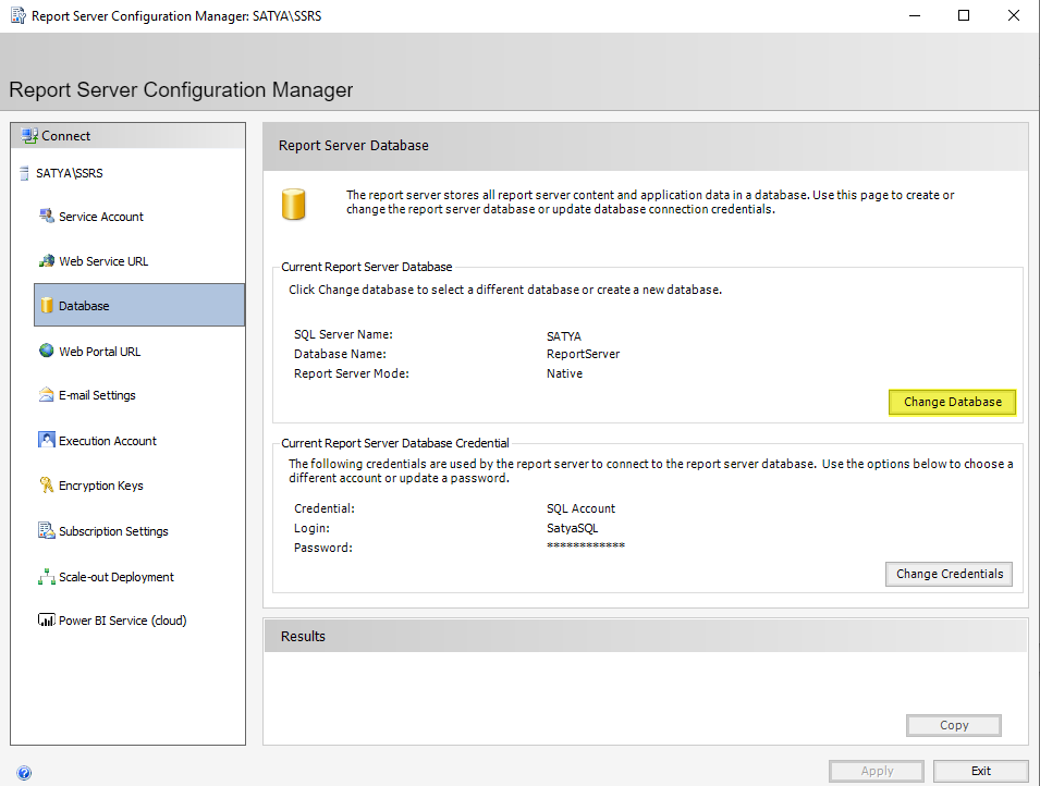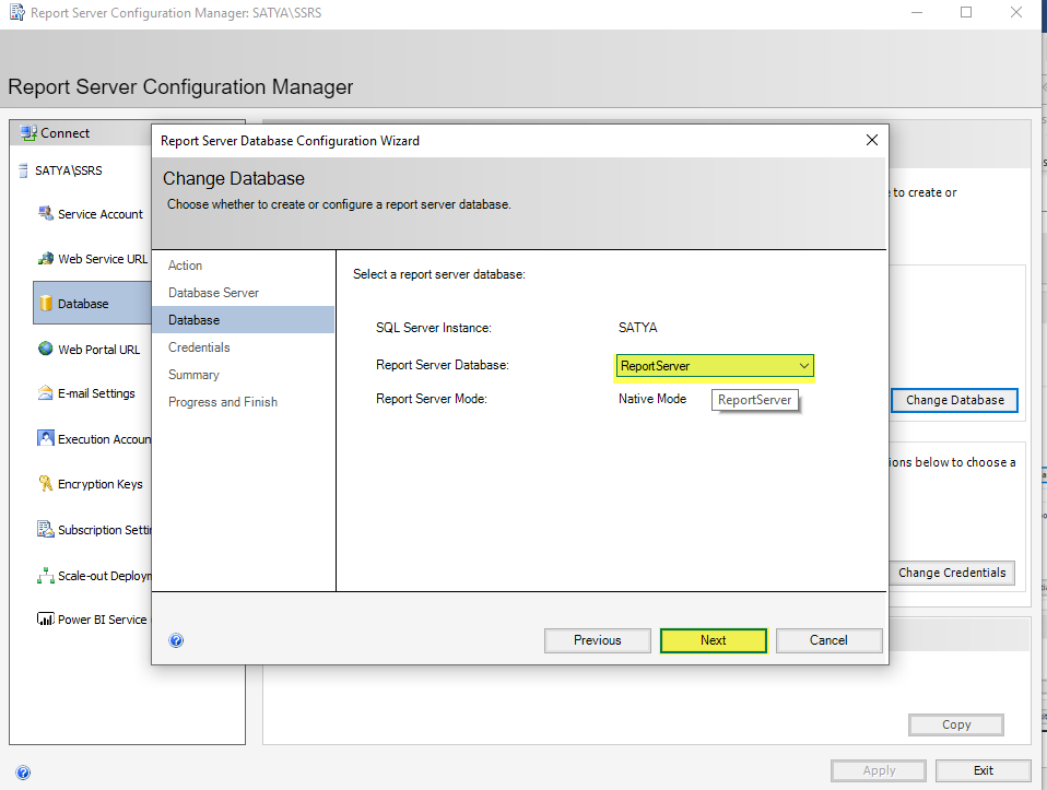 - On the left-hand side of the Reporting Services Configuration Manager, click Database.