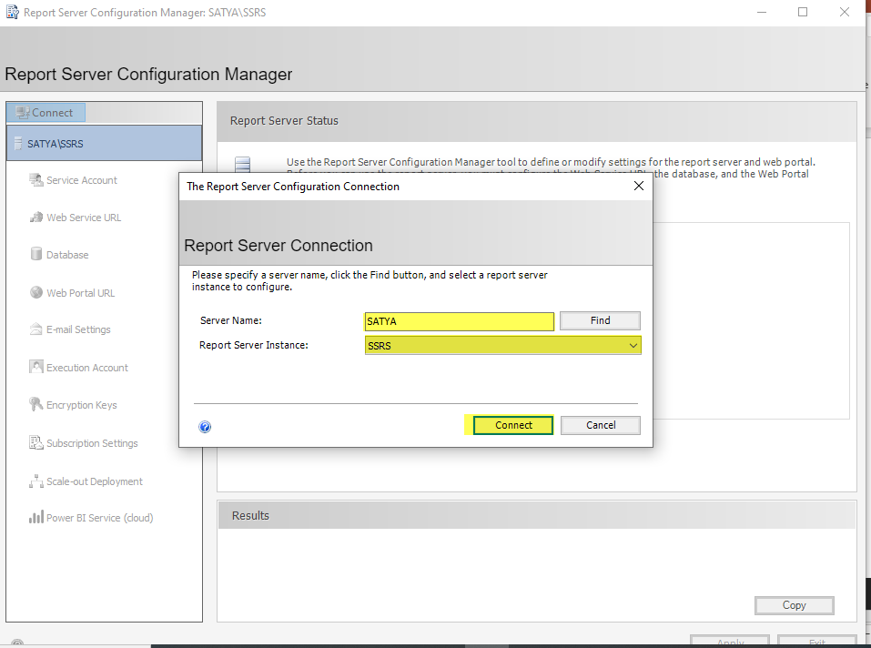 The first step that you need to do in configuration is to launch the SQL Server Reporting Service Configuration Manager and connect to the Reporting Service.