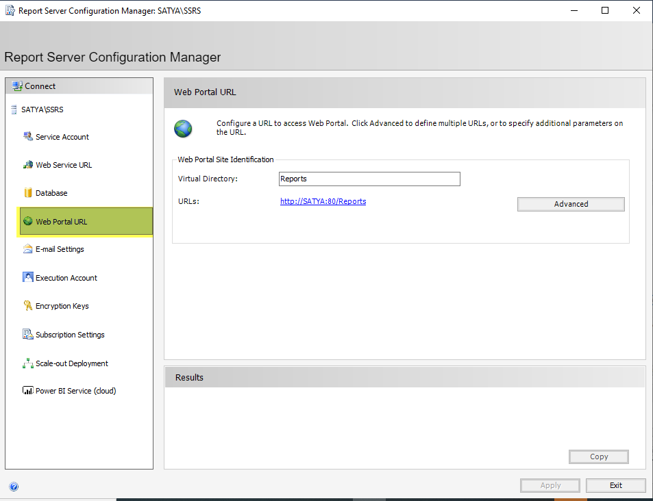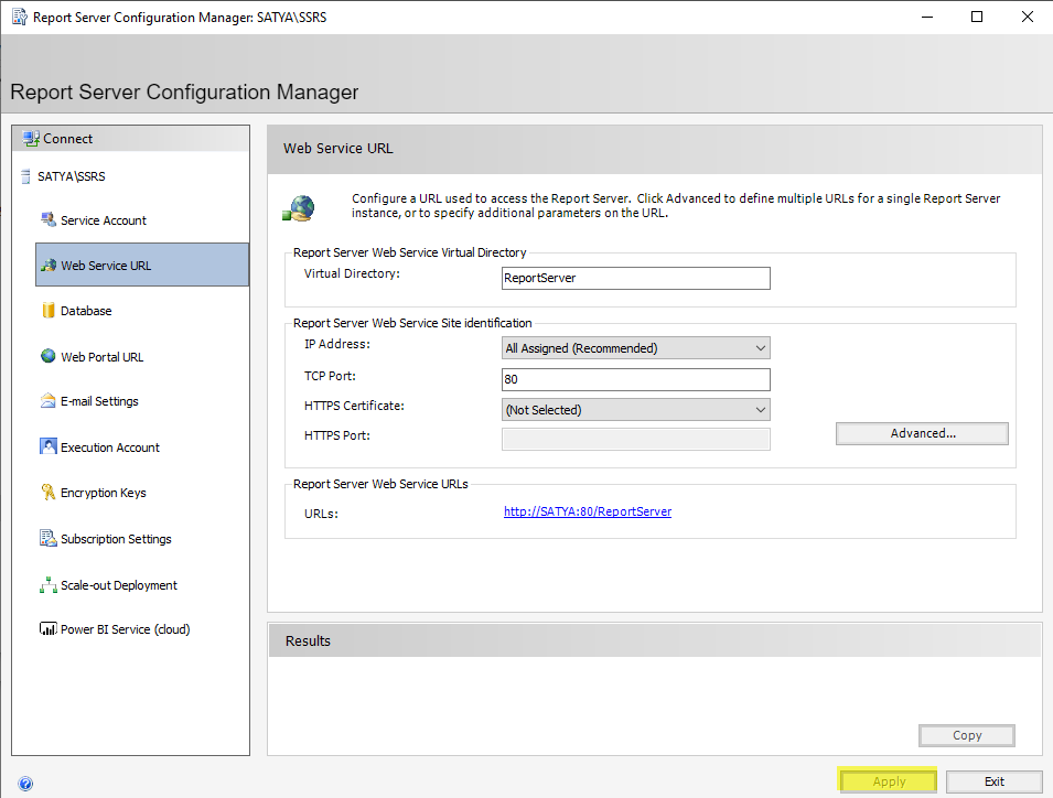 Back to the “Reporting Services Configuration Manager” window, click on “Web Service URL” and click on “Apply“. Not seen in the picture below – sorry.