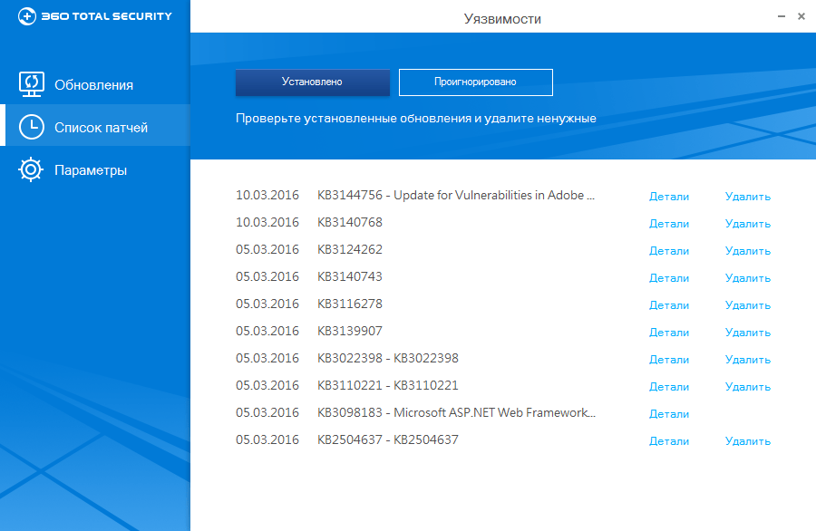 Уязвимости — позволяет отслеживать Все установленные обновления на операционную систему Windows и управлять ими.