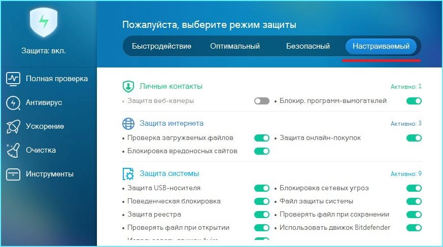 Не покупайтесь на красивые названия режимов, а сразу переходите в пункт «Настраиваемый». Это режим максимальной защиты при правильной настройке. Рекомендую включить всё – все подпункты режима должны иметь зелёный цвет. Не бойтесь, при включении движков Avira и Bitdefender компьютер виснуть не будет, а вот проверка на вирусы станет вестись по трём разным антивирусным базам. У меня не включена только защита веб-камеры, так как на компьютере её нет – остальное зелёное: