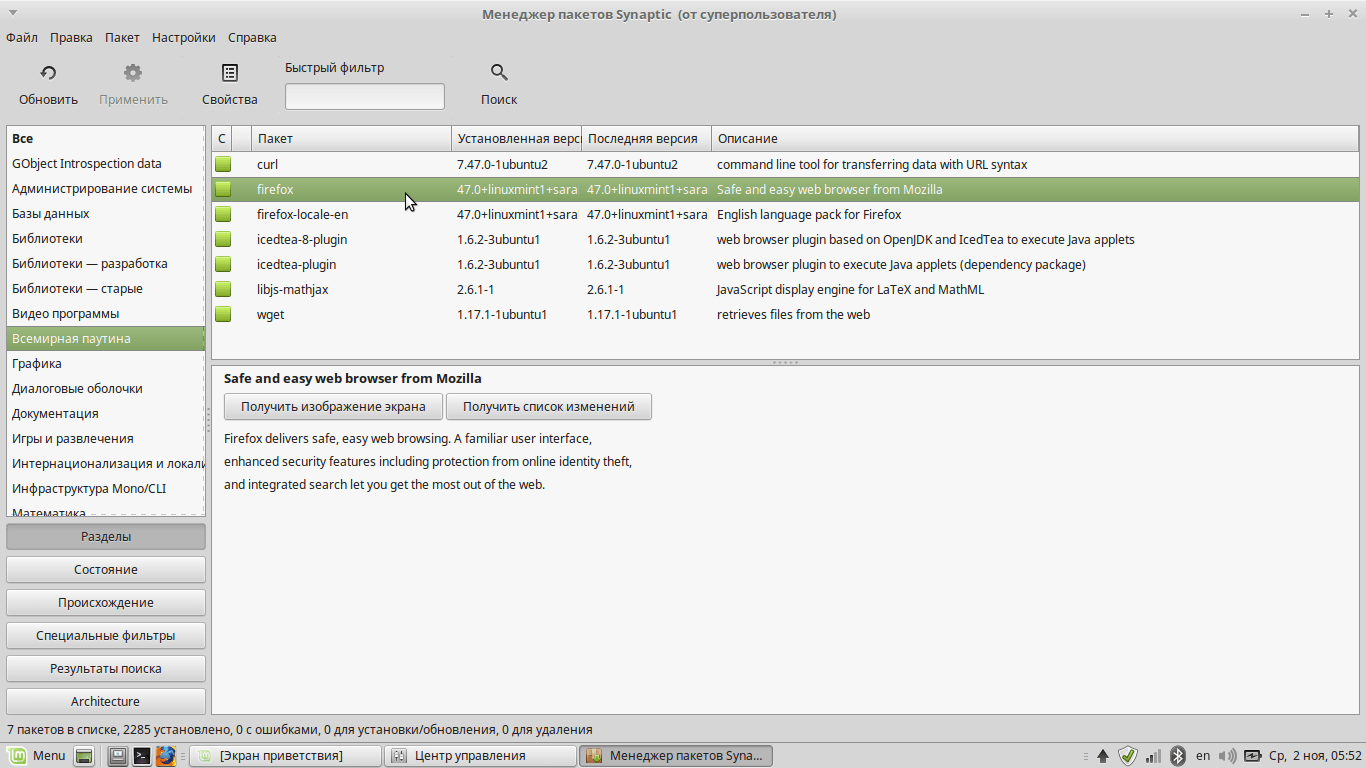 Менеджер программ показывает – что поставлено в пакете с ОС (приложения, помеченные зеленой галочкой). Остальные – доступны для установки из репозитория. При наличии интернета – достаточно выбрать желаемое приложение. Инсталляция производится быстро, предлагаемый менеджером программ софт репозитория полностью адаптирован под вашу версию Linux Mint.