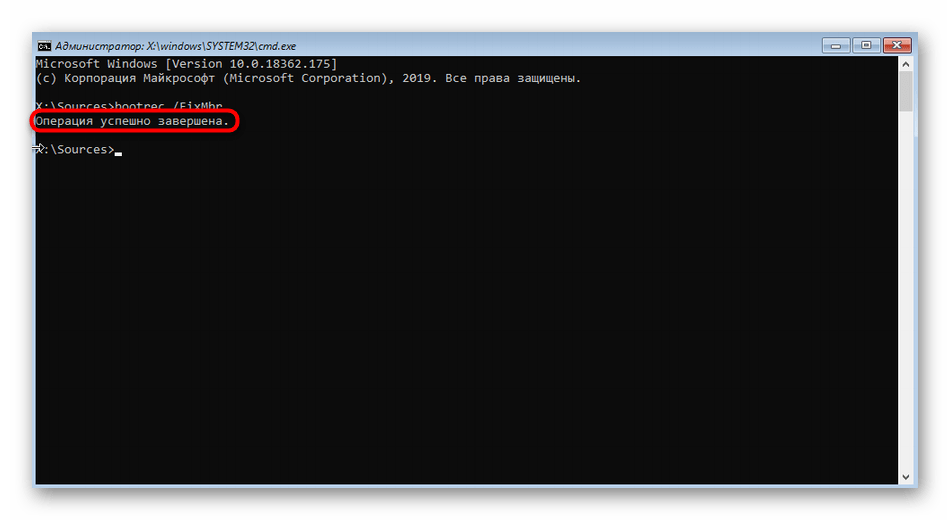 - Когда появится сообщение об успешном проведении операции, ввести в строку надпись «bootrec /FixBoot».
