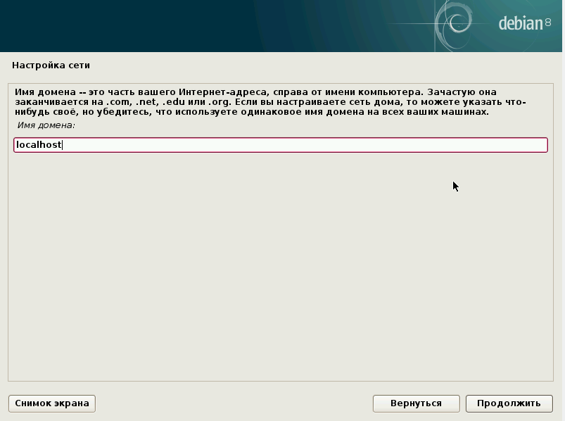 В следующем окне вводим доменное имя (если компьютер у вас не в домене то можно просто localhost) и жмём Продолжить